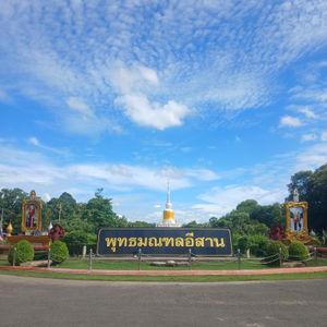 พุทธมณฑลแห่งอีสาน ตั้งอยู่ที่บ้านนาดูน เขตอำเภอนาดูน เป็นเขตที่มีการขุดพบหลักฐานทางประวัติศาสตร์ โบราณคดีที่แสดงถึงความเจริญรุ่งเรืองในอดีต เพราะบริเวณนี้ได้เคยเป็นที่ตั้งของนครจำปาศรีมาก่อน โบราณวัตถุต่าง ๆ ที่ค้นพบได้นำไปแสดงไว้ที่พิพิธภัณฑสถานแห่งชาติจังหวัดขอนแก่น และที่สำคัญยิ่งก็คือการขุดพบสถูปบรรจุพระบรมสารีริกธาตุบรรจุในตลับทองคำ เงิน และสำริด ซึ่งสันนิษฐานว่ามีอายุอยู่ในพุทธศตวรรษที่ 13-15 สมัยทวาราวดี รัฐบาลจึงอนุมัติให้ดำเนินการก่อสร้างพระธาตุนาดูนขึ้นในเนื้อที่ 902 ไร่ โดยบริเวณรอบ ๆ จะมีพิพิธภัณฑ์ทางศาสนาและวัฒนธรรม สวนรุกขชาติ สวนสมุนไพร ซึ่งตกแต่งให้เป็นสถานที่สำคัญทางพุทธศาสนา การเดินทางจากตัวเมืองมหาสารคาม โดยใช้เส้นทางหมายเลข 2040 ผ่านอำเภอแกดำ อำเภอวาปีปทุม แล้วเลี้ยวขวาเข้าทางหลวงหมายเลข 2045 ถึงอำเภอนาดูน ทางลาดยางตลอด ห่างจากตัวเมืองประมาณ 65 กิโลเมตร