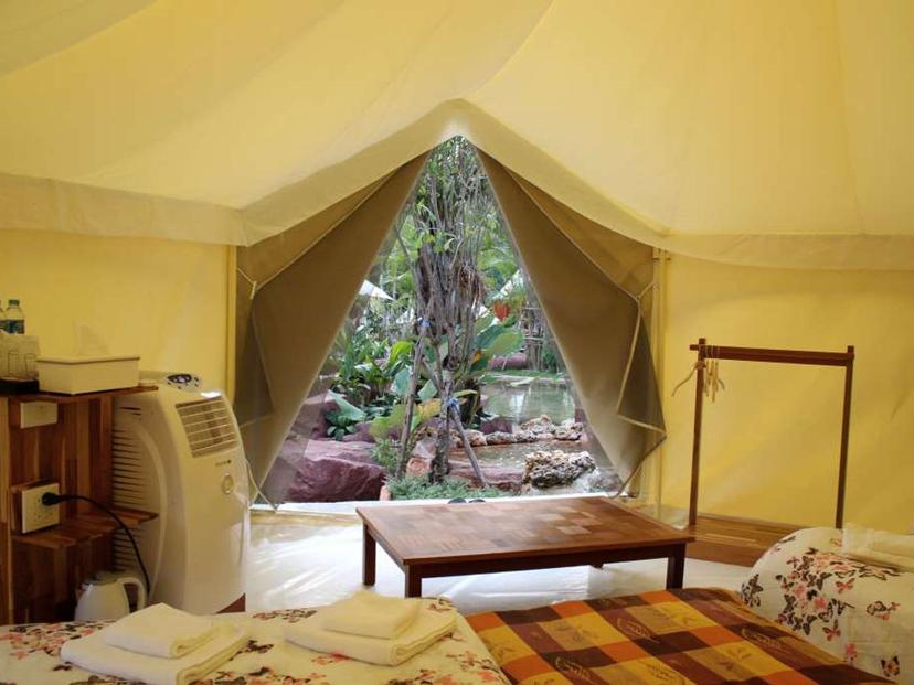 ที่พักสไตล์แคมปิ้งท่ามกลางธรรมชาติ ผสมผสานกับความมินิมอลนิด ๆ ทำให้ออกมาดูทันสมัยและน่าเข้าพัก ด้านหน้าเป็นอาคารกระจกมองเห็นโซนเขาวงกต เอาไว้ให้ผู้เข้